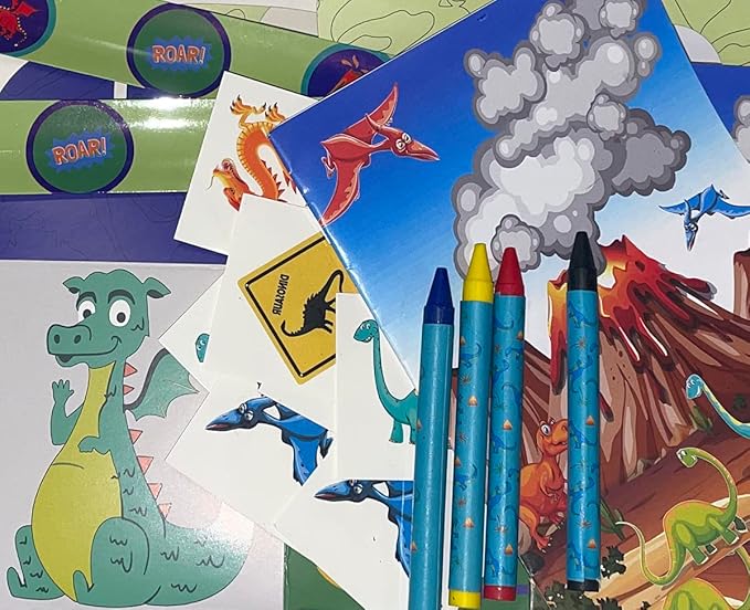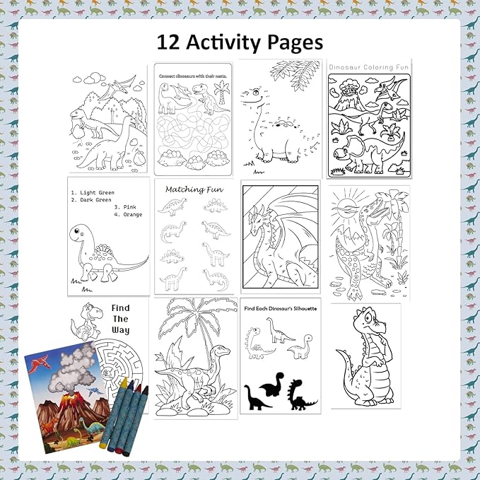 - 12 adorable dinosaur themed activity books with fun dinosaur pictures to color, mazes and connect the dots! The set includes a pack of four vibrant crayon colors such as red, black, blue and yellow!