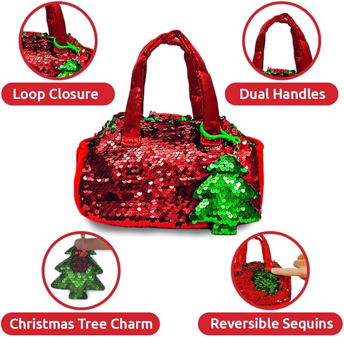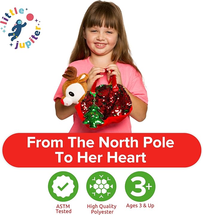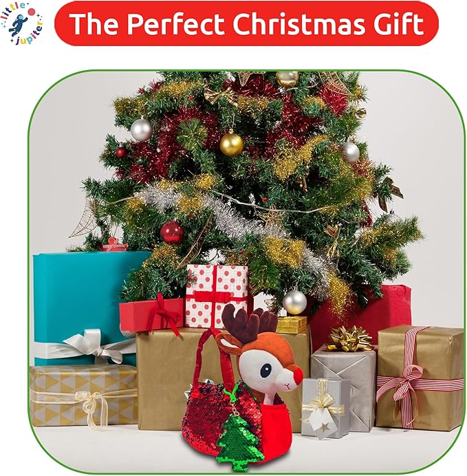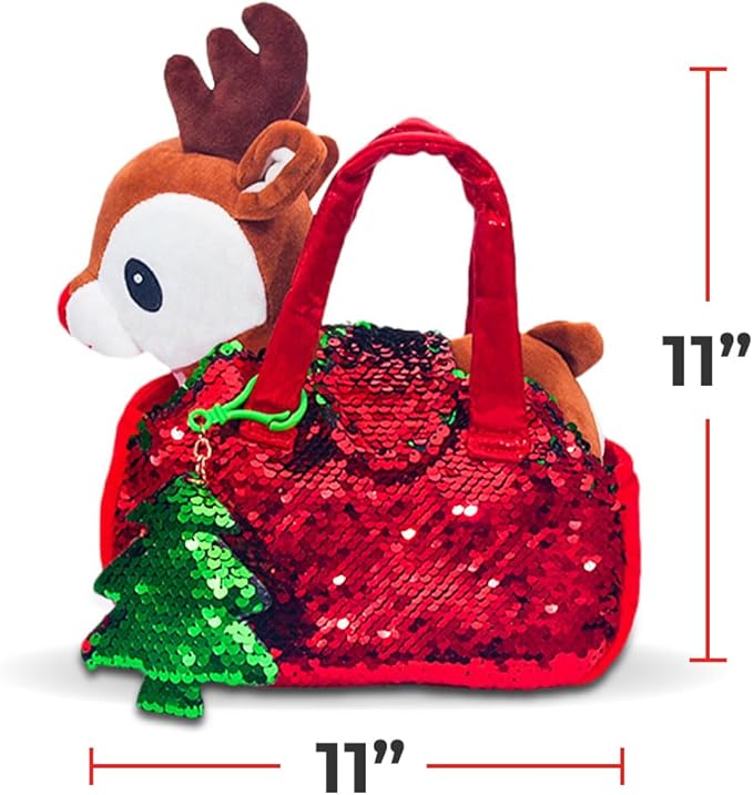 - Complete Playset: 3pc playset includes plush reindeer stuffed animal with sparkling carrier purse bag with reversible sequins, & Christmas tree charm. Plushies make the perfect Christmas presents for girls.