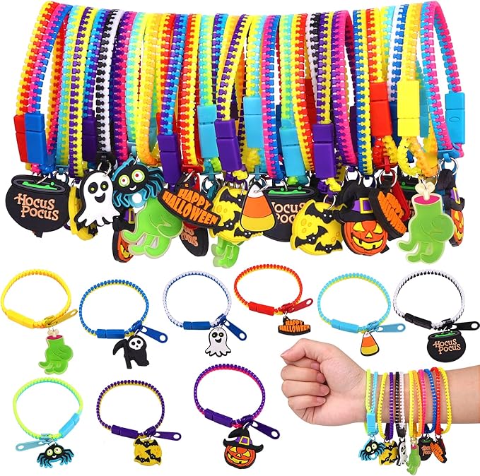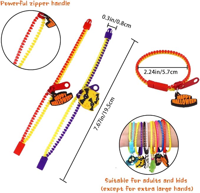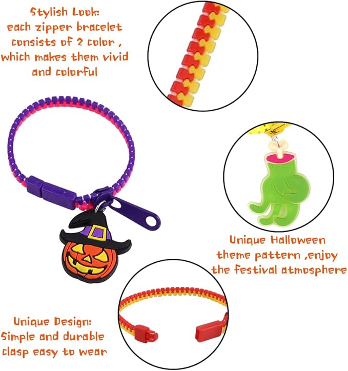 - HALLOWEEN THEMED ZIPPER BRACELET-The package contains 28 Halloween-themed zipper bracelets in 9 different styles. There are enough quantities and styles to meet your and your kid's different Halloween needs.