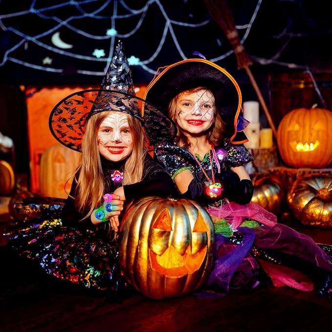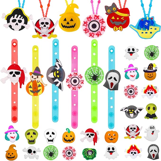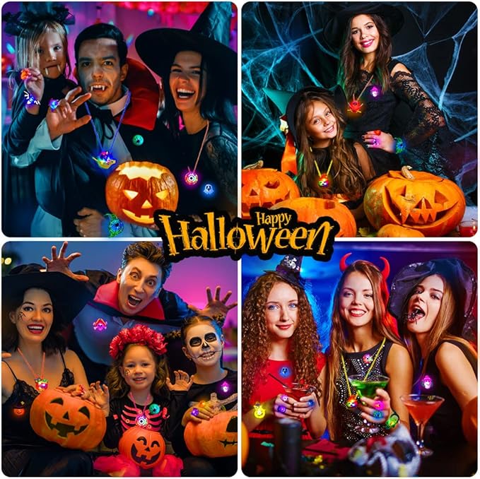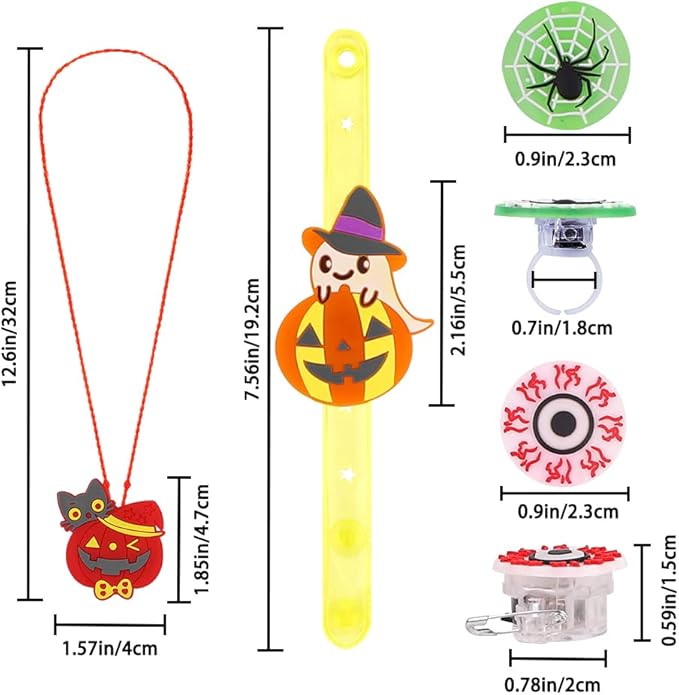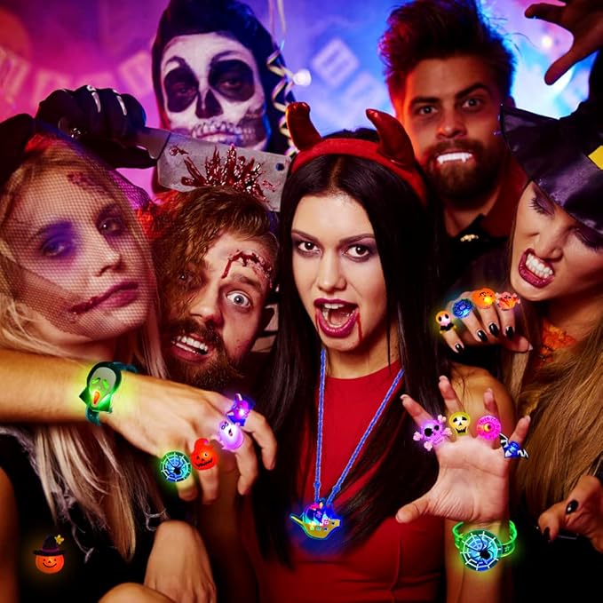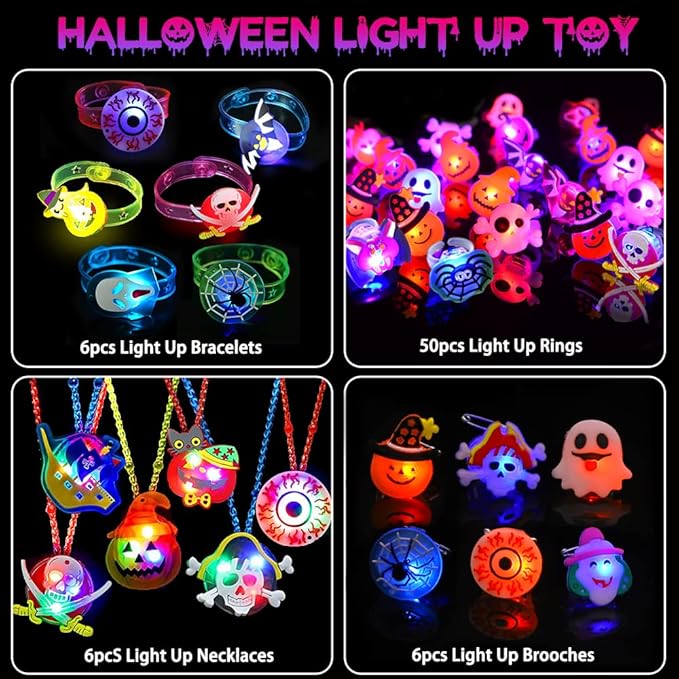 - 🎃68PCS Halloween Light Up Toys: Package includes 50 LED rings, 6 LED bracelets, 6 LED necklaces, and 6 LED brooches.Styles are randomly assigned. There are enough quantities and styles to meet your and your kid's different Halloween decoration needs.(Note:The rings, necklaces, bracelets and brooches are all packaged in a 50 pcs box The quantity mark on the box does not represent the actual quantity, there is a total of 68 pcs in the box.)