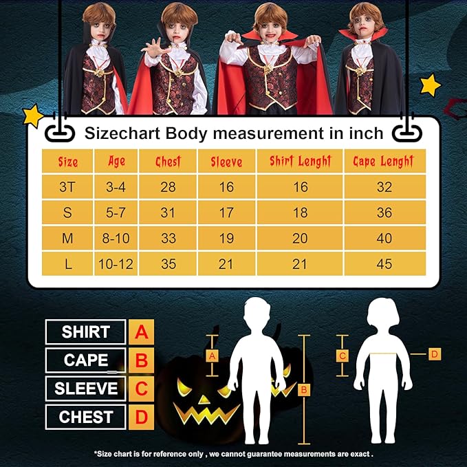 • [Vampire Costume Material] - Vampire Costume is Made of 100% Comfortable Polyester. Suitable for toddlers and kids. Realistic look, super durable Perfect Details and Stitching Crafts. Meets our Dress Size Standard