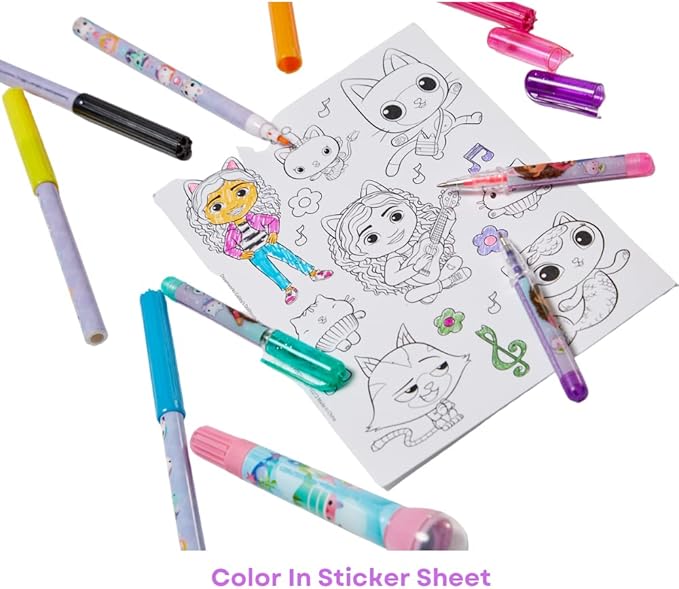 - GABBYS DOLLHOUSE ART ACTIVITY SET – The complete Gabby themed art set includes: 6 markers, 3 gel pens, an ink pad, a roller stamper with marker, a 5 x 7 inch puffy sticker sheet, a 6 x 4 inch spiral doodle pad, a 5 x7 color-in sticker sheet, and a large character color-in.