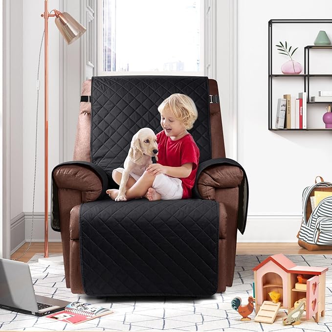 KinCam 100% Waterproof Recliner Chair Cover, Reclining Couch Covers for Pets, Dogs, Recliner Couch Slipcover Furniture Protector with Elastic Straps for Kids(23.6", Black)