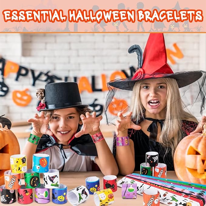 - 🥳Awesome Halloween Party Favors: The slap bracelets can be used as Halloween party favors/supplies, Halloween trick or treats favors, Halloween gifts, Halloween treat bags favors, Halloween goodies bag fillers/stuffers, Halloween giveaway favors, Halloween treat bag stuffers, Halloween classroom prize for kids. Amazing Halloween party favor set waiting for your little trick or treaters!