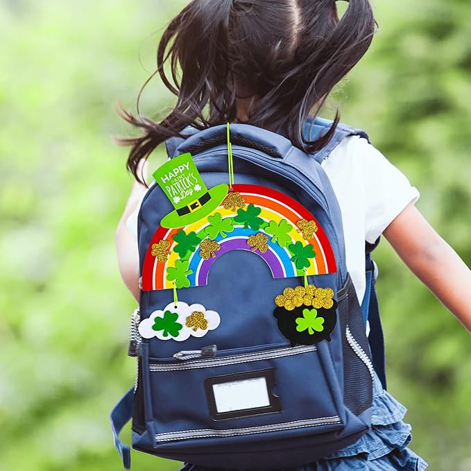 • 12 Sets St. Patrick's Day Rainbow Ornaments DIY St. Pat's Craft Kits: 12 pcs foam rainbow shaped cutouts, 12 pcs foam cloud shaped cutouts, 12 pcs foam black cauldron shaped cutouts, 12 pcs foam leprechaun hat cutouts stickers, 9 sheets gold glitter foam St. Patrick's Day stickers (72 pcs shamrock and lucky 4-leaf clover stickers and 144 pcs gold coin stickers), 12 sheets green foam clover stickers (96 pcs), 36 pcs satin cords, 12 pcs adhesive wall hooks, 1 pc step-by-step instructions.