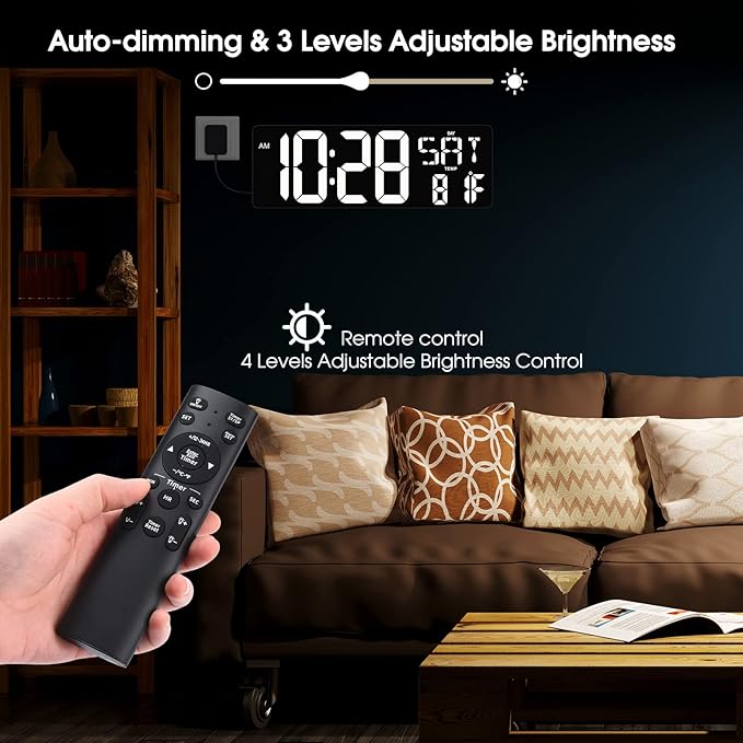 - Large screen 4 gear brightness adjustment: The large 16.5-inch screen and Big numbers,Easy to Read screen,4 level- Remote control adjusts brightness.Comfortable visual experience.It's very comfortable to watch time during the day, and it won't affect rest at night.
