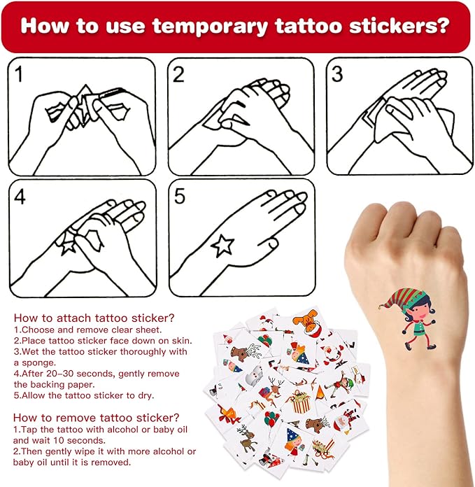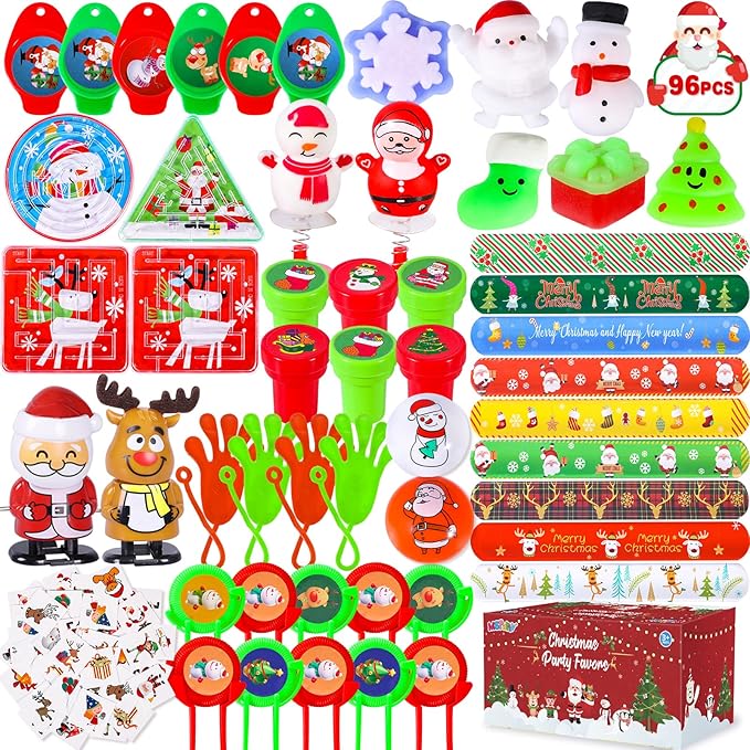 - Assorted Christmas toys: Includes 11 types of fun Christmas toys—2 wind up toys, 2 pull-back cars, 2 jumping poppers, 4 maze toys, 6 squishies, 6 stamps, 6 whistles, 8 sticky hands, 10 slap bracelets, 10 ejection frisbees, and 40 Christmas tattoos—totaling 96 pieces for endless joy and excitement.