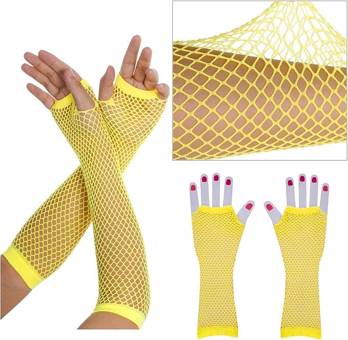 - Package Content: 1 pc yellow yarn skirt(waist wide: 6.8"/17.5cm, which can be stretched to17"/43cm), 1 pair long gloves(10.2"/26cm), 1 pair of yellow leggings socks(13.7"/35cm), 4 pcs solid color necklace(14.7"/35cm), a pair of shutters glasses and 1 pc lace headband bow.
