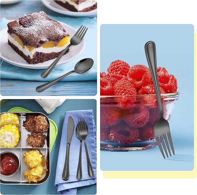 - 【ATTRACTIVE BLACK KIDS SILVERWARE】Simple slimline adult look with attractive black color as parents’ flatware, Easy catch children’s attention, Makes child feel like grown ups and more independent to eat, Kids knives with serrated edge easy for them to use and safe to learn with cutting skills