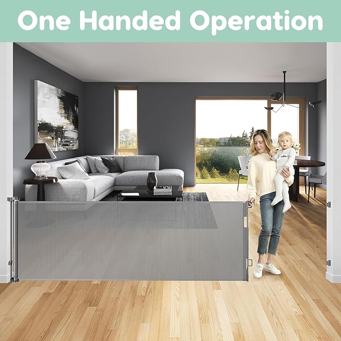 - Retractable Gate: The extra wide dog gate for the house can be retracted, so you can roll up the mesh when you don't need to use it and save your space. Easy for your friends to pass through the outdoor baby gate when you have a party or friends visiting your home.