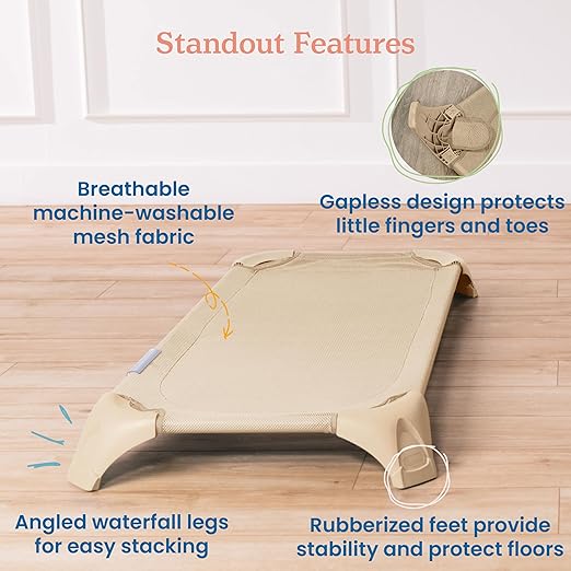 - Classroom Cot: Set of six stacking cots for rest time in childcare centers, daycares, and classrooms; elevate children off the floor to keep them cool, clean, and stable