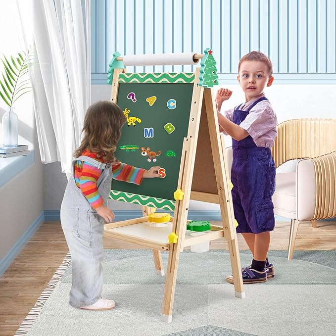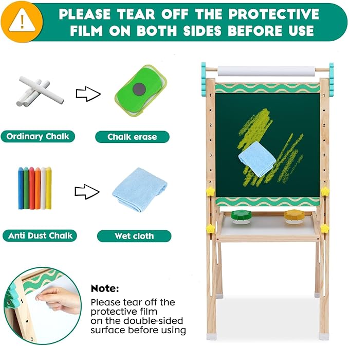 - 🎄Integrated Double-Sided Easel: The double-sided drawing board is perfect for your children to be creative. Note: Please tear off the protective film before use. The blackboard needs to be wiped with a damp cloth.