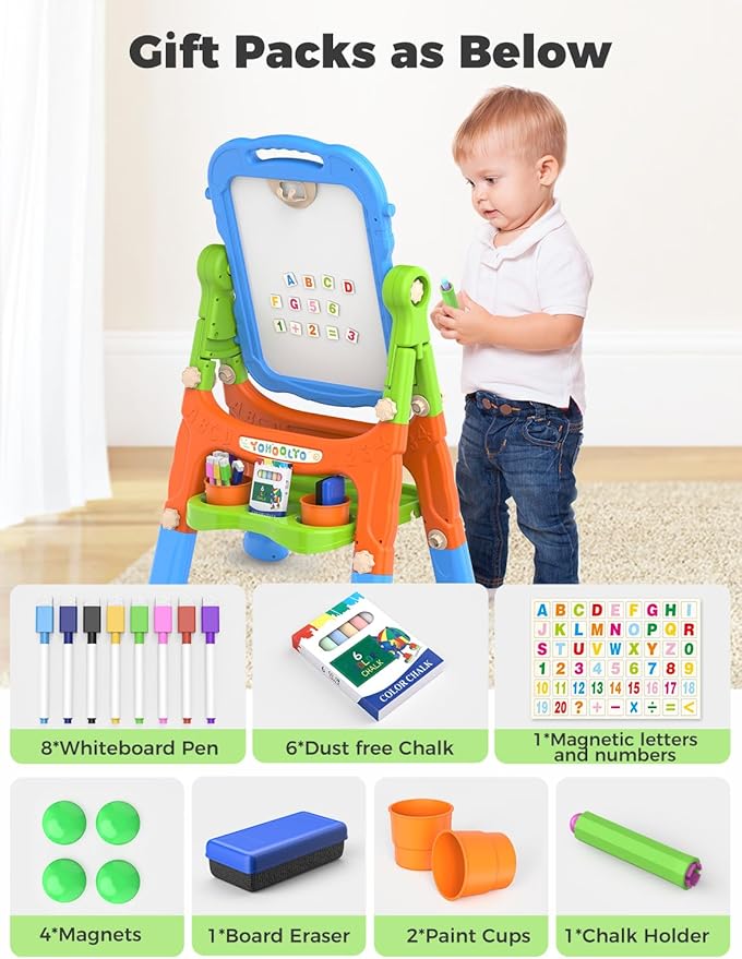 YOHOOLYO Kids Easel Standing Art Easel for Kids, Double Sided Magnetic Chalkboard Whiteboard Dry Eraser Board Great Gift for Girls and Boys