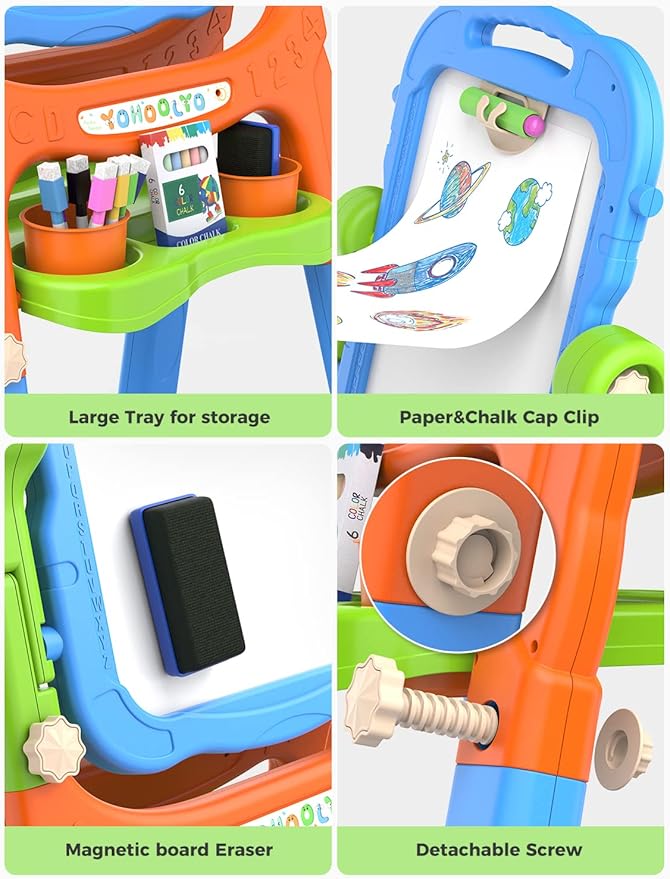 - Kids Easel 360° Rotatable White and Chalk Board: One side is a magnetic dry erase board and the other side is a magnetic black chalkboard. Bring hours and years of enjoyment for the children