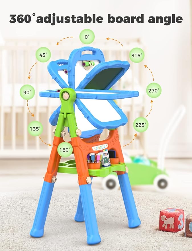 - Kids Easel 360° Rotatable White and Chalk Board: One side is a magnetic dry erase board and the other side is a magnetic black chalkboard. Bring hours and years of enjoyment for the children