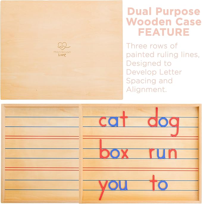 - DUAL PURPOSE WOODEN CASE: The Montessori & Me Movable Alphabet features a dual-purpose wooden case. Just flip open the wooden lid to reveal three rows of painted ruling lines, ready for your child’s letter placement! This clever design allows the lid to double as your child’s work space and helps with development of letter spacing and alignment.
