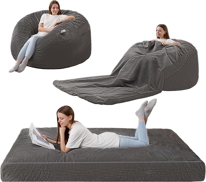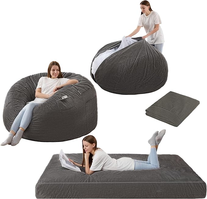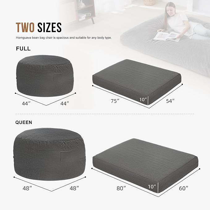 Homguava Corduroy Bean Bag Chair, Variable Shape from Bean Bag to Matress, Convertible Beanbag Chair for Home, Living Room(Grey, Queen)