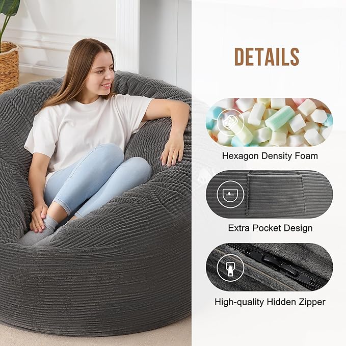 - Thick and Washable Cover: The cover of bean bag chair is washable for a further care. You can easily put it into washer to clean it like new. It is made of breathable premium corduroy with fine texture, soft and skin-friendly from touching. It is also anti-pilling and not easy to fade. Moreover its double stitched seams and premium zipper ensures for super durability & strength.
