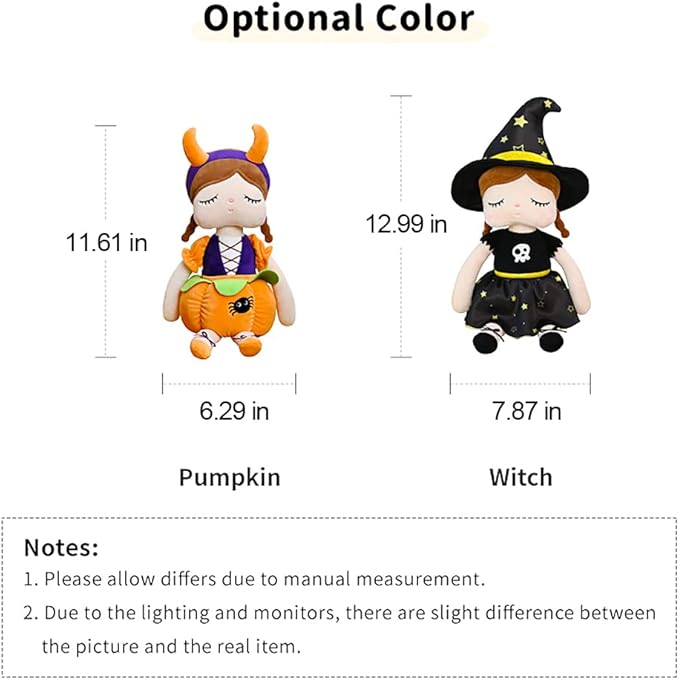 - GREAT GIFT. This soft doll is the ideal gift for almost all occasions: birthdays, baby showers, Halloween, etc. It is also a charming decorative doll to put on any shelf or in the room. Children and adults will love this cute plush doll.