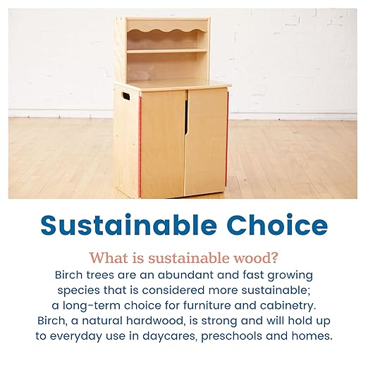 - Kitchen Playset: Prep meals, display kitchen accessories, and store supplies in the wooden cupboard designed to inspire imagination during pretend play in a classroom or playroom