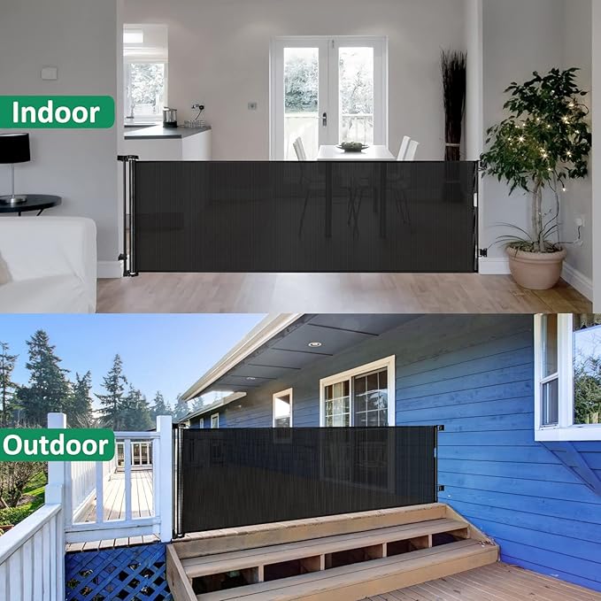 - Perfect for Indoor and Outdoor: Each set includes 1 extra wide retractable baby gate and required mounting accessories. Child Gate can be used both indoors and outdoors, such as open kitchens, bottom of stairs, doorways, decks, etc., providing a safe area for babies and pets.