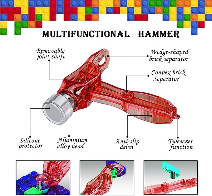 - PRACTICAL AND PROFESSIONAL TOOL SET. This upgraded building blocks tool kit is specially designed for toy building bricks lovers and it is compatible with LEGO & Technic and building bricks from most major brands. The whole set comes with a strong tin box, including 1 multifunctional hammer, 1 brick pliers, 1 pair of tweezers, 5 brick separators for both classic LEGO &Technic blocks and Mini bricks of different brands,1 adjustable storage box, 5 finger protectors with different sizes. The whole set will make your building blocks assembly and disassembly much faster and more efficient.