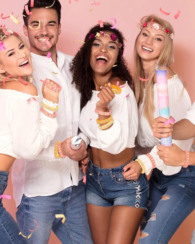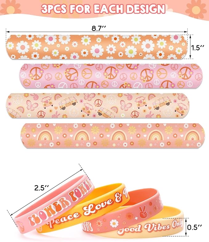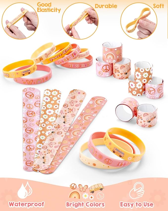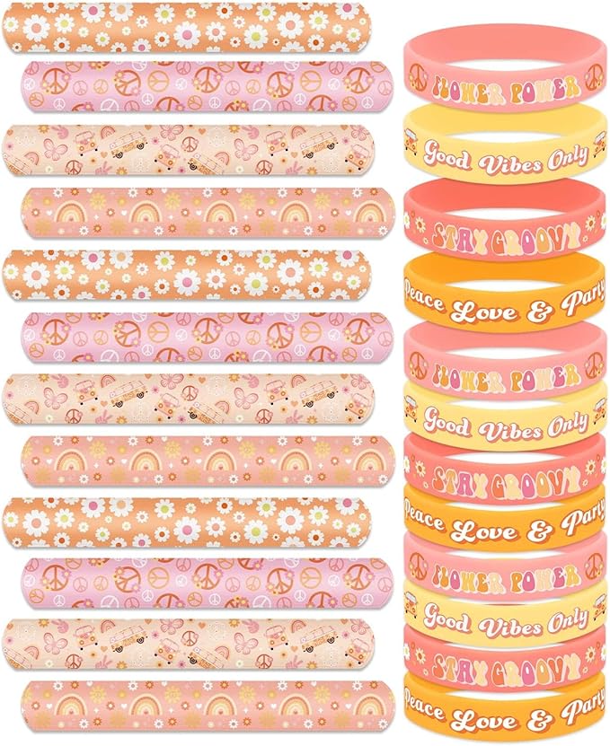 - ADORABLE GROOVY PARTY FAVORS - All of our bracelets are full of retro elements featuring hippie bus, daisy, butterfly, peace sign, and rainbow. This groovy silicone bracelets assortment is everything you’ll need to get ready for the fun.