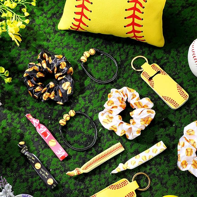- Comfortable to Use: the hair scrunchy is mainly made of satin fabric, the hair tie is made of polyester and spandex, with good flexibility, and you can wear them on your wrists as decorations; The softball bracelet is mainly made of acrylic, not easy to fade or break; Lipstick holder keychain and makeup bag is mainly made of polyester, nice to your touch