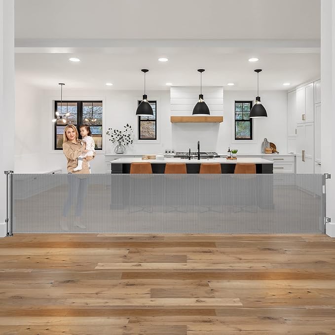 - Retractable Design - Saving Space: This extra wide retractable baby gate is easy to use in high traffic areas. When not in use or when guests are visiting, the long baby gate retracts easily, allowing for maximum flexibility and convenience. This new retractable gate has no bottom rail, no trip hazard.