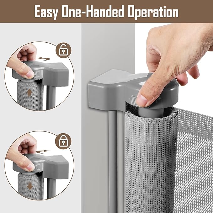 - One-Handed Operation to Open and Close The Toddler Gate: This extra wide dog gate includes a double locking mechanism that can safely close the child gate to prevent babies from accidentally opening it. Adults can easily open and close the mesh baby gate with 1 hand for easy access.