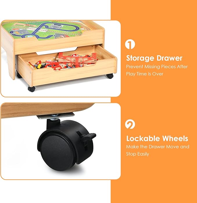 - 【Easy to Play & Store】 The train table with storage can attach each other with the magnet and the tracks feature a puzzle-like connection, which is easier for kids to play and DIY. You can also place the removable tabletop on the floor for more building space. In addition, the built-in drawer provides large space to store the accessories.