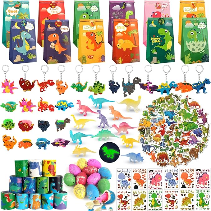 - 💖Dinosaur Birthday Party Supplies Include - 12 mini dinosaurs, 12 dinosaur slap bracelets, 12 dinosaur keychains, 12 dinosaur rubber rings, 12 sheet make-a-face dinosaur, 12 dinosaur eggs, 12 dinosaur party bags, and 50 dinosaur stickers.