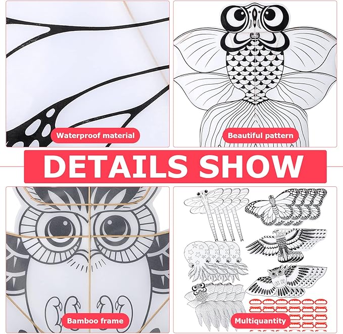 - DIY Animal Kites Set: you'll get 24 packs of DIY animal painting kites, including 4 packs of butterfly kites, 4 packs of dragonfly kites, 4 packs of goldfish kites, 4 packs of octopus kites, 4 packs of eagle kites and 4 packs of owl kites, 24 kite handles with 328.08 feet/ 100 meters of string and 24 pcs water color pens