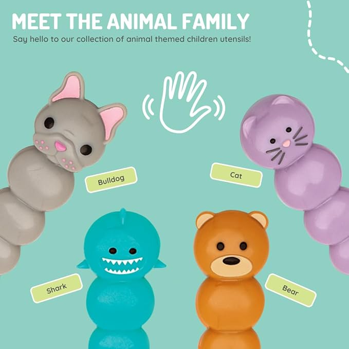 - Colourful bulldog, cat, shark and bear spoon and fork sets make feeding fun!