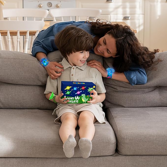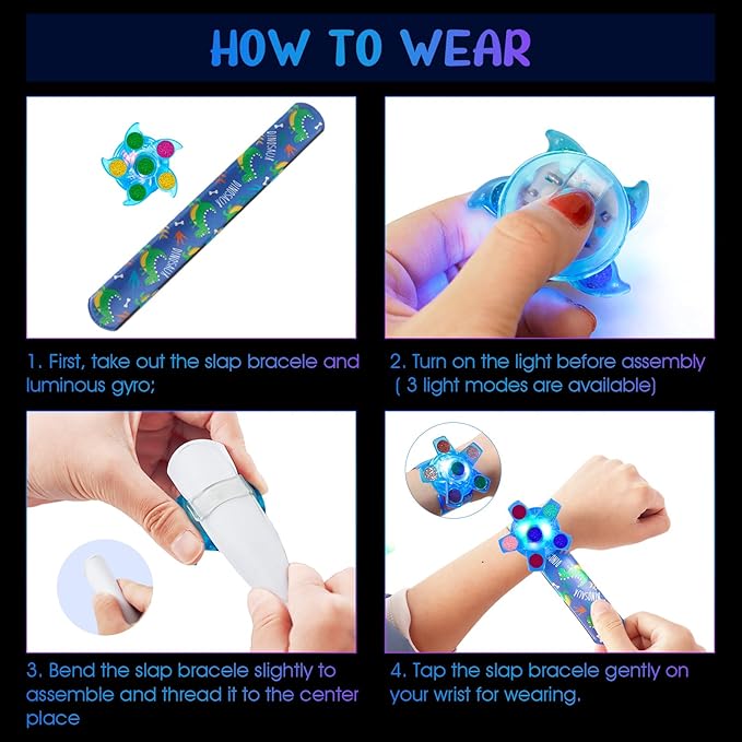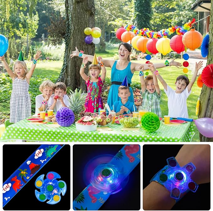 - [Upgrade design]: The slap bracelet is a dinosaur element, and the rotating toy is made of plastic, which is very strong and not easy to break. Press it to spin quickly and look chic in the dark, adding to the fun for the kids.