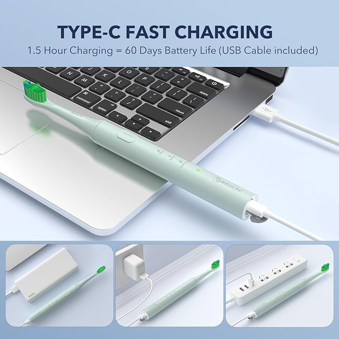 - 【Type C fast Charging & Light and Portable】--- 1.5 Hours Charging for 60 Days Using (2 times per day)--- [1] Arisson rechargeable electric toothbrush, convenient and easy to charge using a widely available charging cable (Adapter is not included), having longer battery life compared to traditional charging methods. [2] The ultrasonic toothbrush weighs only 1.6 Oz, the lightweight handle makes this electric toothbrush suitable for both kids and adults. Great for carrying and traveling.