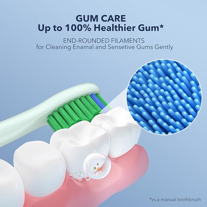 - 【"W" shape design & 4 DuPont Brush Heads】--- More comprehensive and gentle cleaning experience --- [1] Unique "W" shape design to suit teeth surfaces and remove up to 100% more stains from hard-to-reach spots, minimize the risk of damage to gums and tooth enamel. [2] Comes with 4 replacement toothbrush heads. Each brush head lasts 3 months so 4 heads will last for around one year.【NOTICE: Blue indicator bristles fade in color to let you know when it's time to replace the brush head】