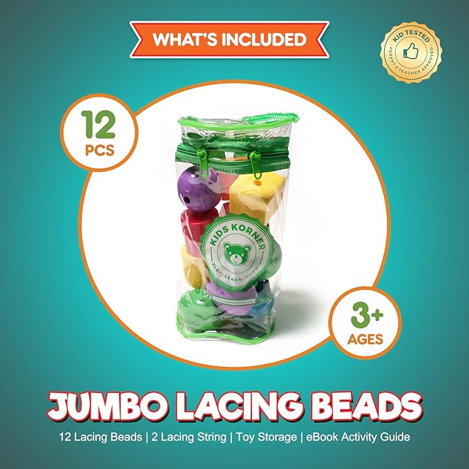 - WHAT’S INCLUDED | You will receive 12 jumbo beads in 4 shapes and 6 rainbow colors. You also will receive 2 lacing strings:1 for beginner lacers that features a thick threading tip and a knotted end so your beads do not fall off and a standard lacing cord to challenge your little one. After play, store the stringing beads in the zippered storage tote and off you go!.