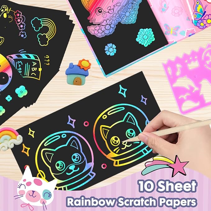 - Cute Color Pages Set: Contains 30 pcs Coloring Pads, 10 pcs Rainbow Scratch Papers, 8 pcs Double-Ended Colored Pencils, 1 pc Wooden Styluses and 1 pc Drawing Stencil, there is no need to order coloring pads and coloring pencils separately, highly cost-effective; Great birthday gift, christmas gift, party favors or school supplies for kids