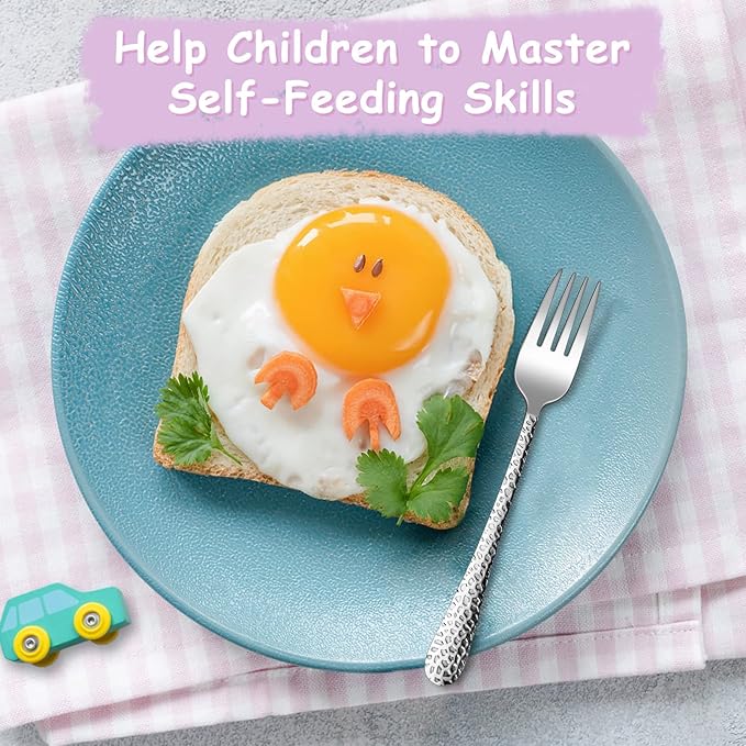 • EASY TO SELF-FEED: This kids forks set with hammered handle design looks like adult utensil, Give a feel of independence to kids, Mini size fit for kids small hands, Help kids learn how to eat quicker and effortless