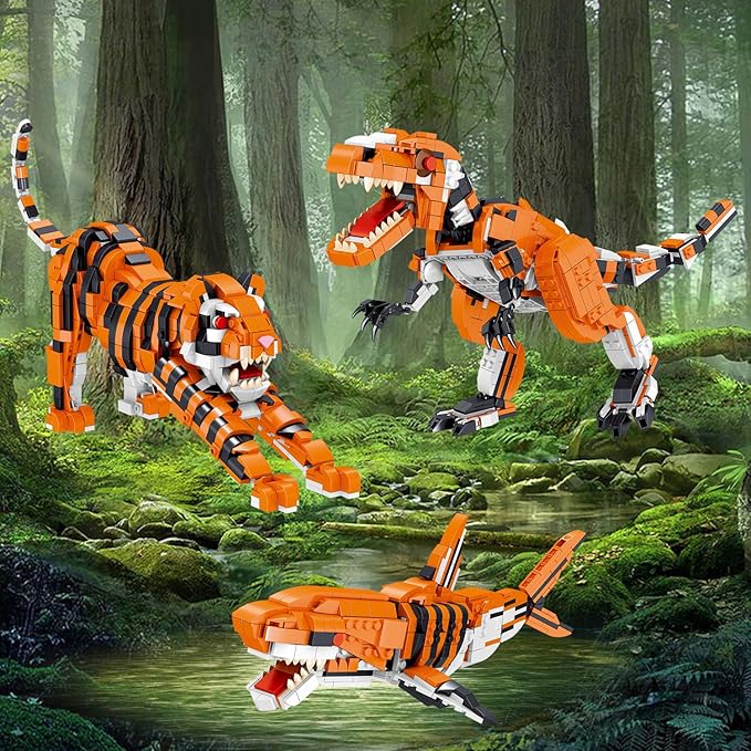 - 【Realistic Shape Design】Tyrannosaurus rex toy can move its head, Body, Shoulders, Jaw, Legs and tail. Tiger toy can move its jaw, Legs, Feet and tail. Shark toy's head, Body and tail can Swing left and right, the fins can swing up and down. More than 10 flexible joints are special design to pose in different poses, Satisfying the love of building block fans for animal model theme, Helps provide hours of pretend play for block fans