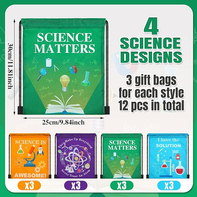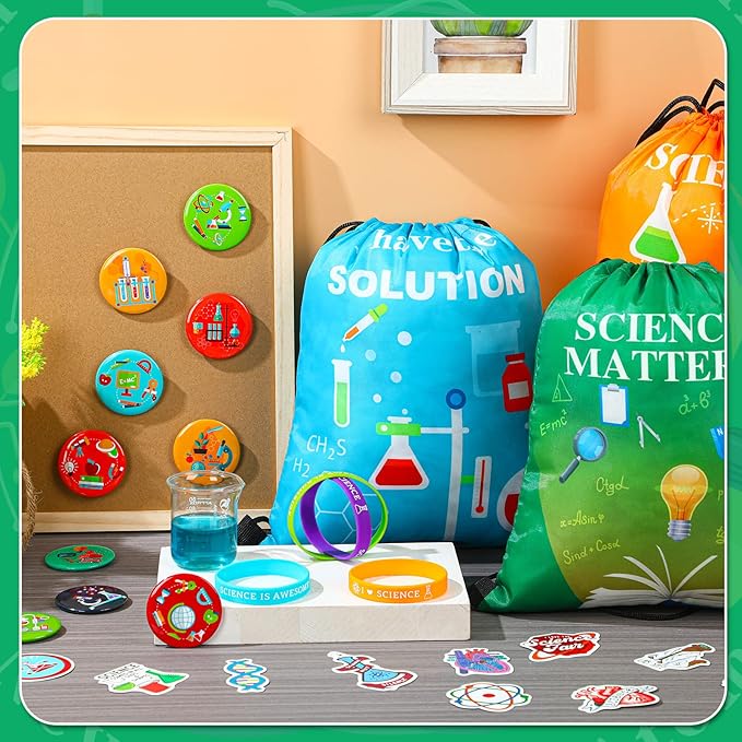 - Scientific Party Favors: you will receive 12 scientific drawstring bags, 12 scientific wristbands, 12 scientific buttons pins and 50 scientific stickers, a total of 86 pieces, plenty of party supplies are enough to meet your needs