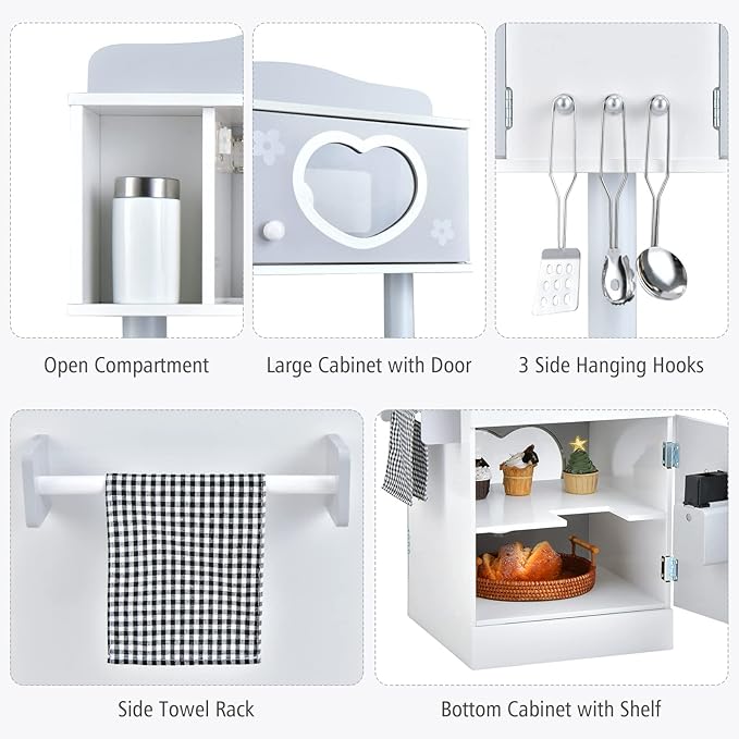 - 【Additional Fun & Storage Space】Realistic ice dispenser and cute clock bring more fun. Kids can put the ice cubes, press and get ice cubes. Besides, this pretend cooking set also features sufficient toy storage space, including 1 wide top, 1 open compartment, 1 large compartment with door, 1 towel rack, 1 bottom cabinet with shelf and 3 hanging rack.