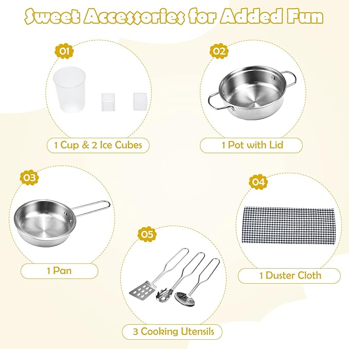 - 【Sweet Accessories for Added Fun】 There is no need to buy accessories, as the kids kitchen play set is complete with 1 cup & 2 ice cubes, 1 pot with lid, 1 pan, 3 cooking utensils and 1 duster cloth. All of these can greatly encourage your little chef to play and learn to identify different cooking supplies.