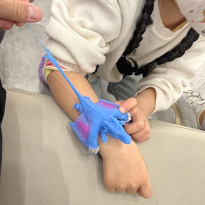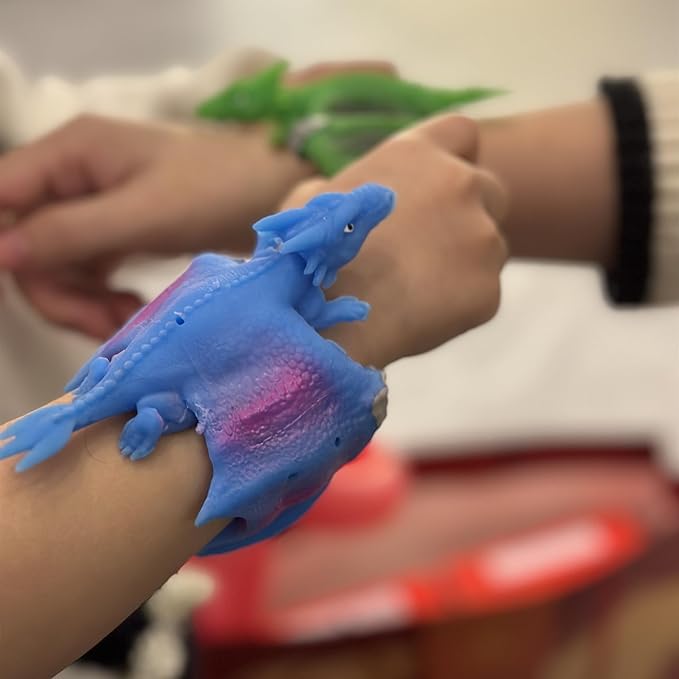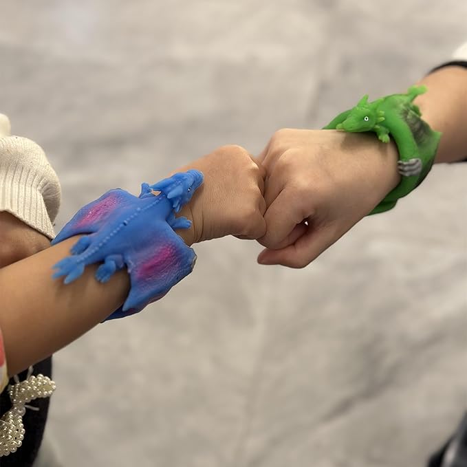 - 2 in 3 Slap Bracelet Toy: This toy is not only traditional slap bracelet toys but also dinosaur model toys.Skin-friendly silicone material can protect your hand dinosaur head and tail can be stretched more interesting than traditional Slap Bracelet toys