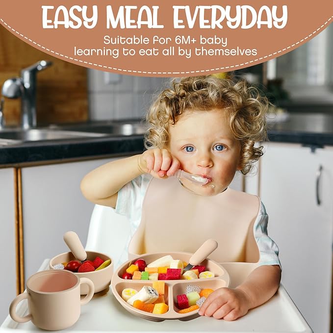 - Silicone Baby Feeding Set: the package comes with 24 sets of silicone baby feeding set in 3 different colors of walnut color, beige, smoky gray, 8 pieces per set, and each set contains a suction divided plate, a pair of spoons and forks, an adjustable silicone bib, a complementary food bowl, a snack cup, a silicone spoon, and a straw, which covers the basic utensils for baby food, helping your baby transition to self eating