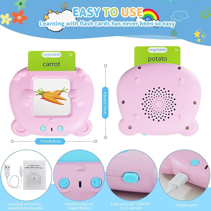 - 🏫【 Flash Cards For Toddlers 】This therapy toy set includes a card reader,112 double-sided flashcards and USB charging cable.This speech therapy toy includes a card reader and 112 double sided flash cards covering 12 subjects like shapes, colors, animals, daily necessities, transports, food, fruits, vegetables, costumes, nature, persons & jobs.
