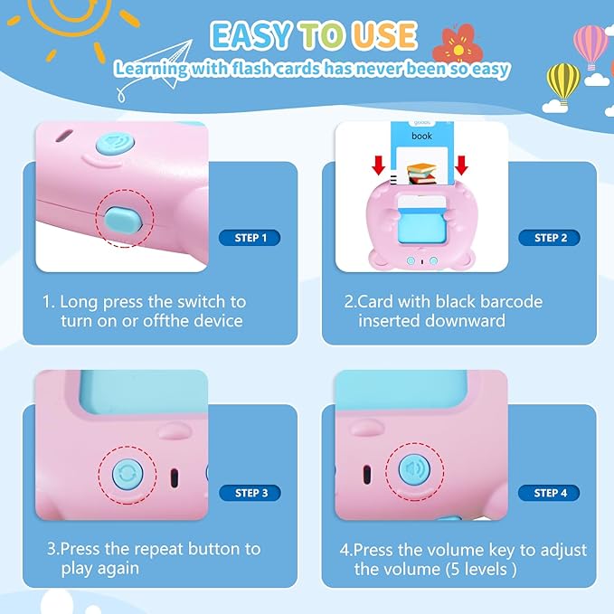 - 🚘【 Lively Voice 】Insert the card to the flash cards educational toys, the reader will pronounce the words with standard American pronunciation.The reader can not only read the word, but also make sounds that imitate animals or transport’s sound (some cards don't have sound effect).Press left button to repeat the pronunciation and sound, press volume button to adjust sound.