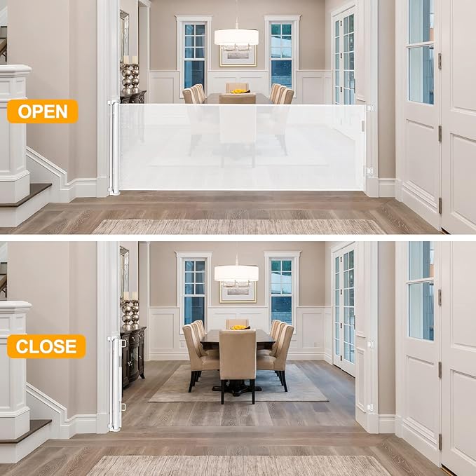 - Easy to Use for Adult : adults can open the extra wide retractable pet gate with one hand, while children cannot. The extra wide baby gate come with detailed installation instructions and is very easy to install.