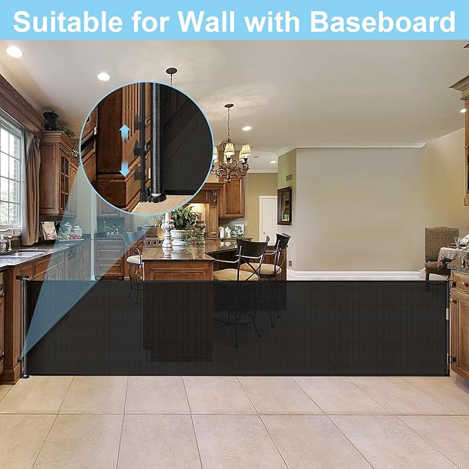 - Retractable Gate : the retractable dog gate is a retractable gate, when you have a party at home or friends visit, you can roll up the mesh of the extra wide dog gate, convenient for your friends to pass.